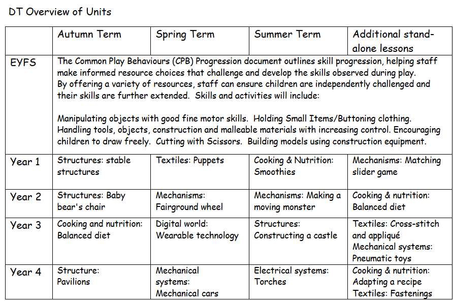 In Design and Technology, children acquire and apply knowledge and understanding of materials and components, mechanisms and control systems, structures, existing products, quality and health and safety.